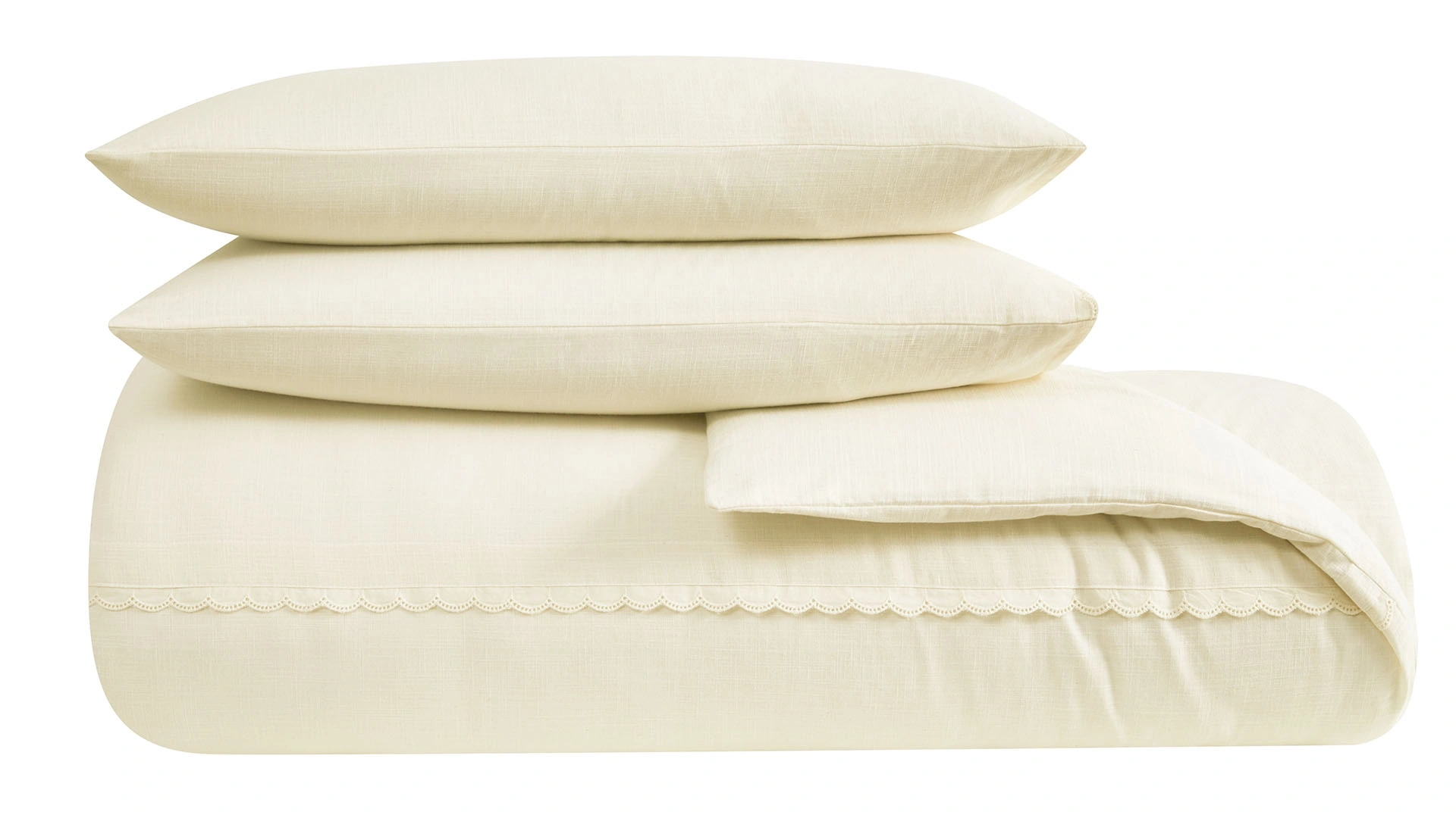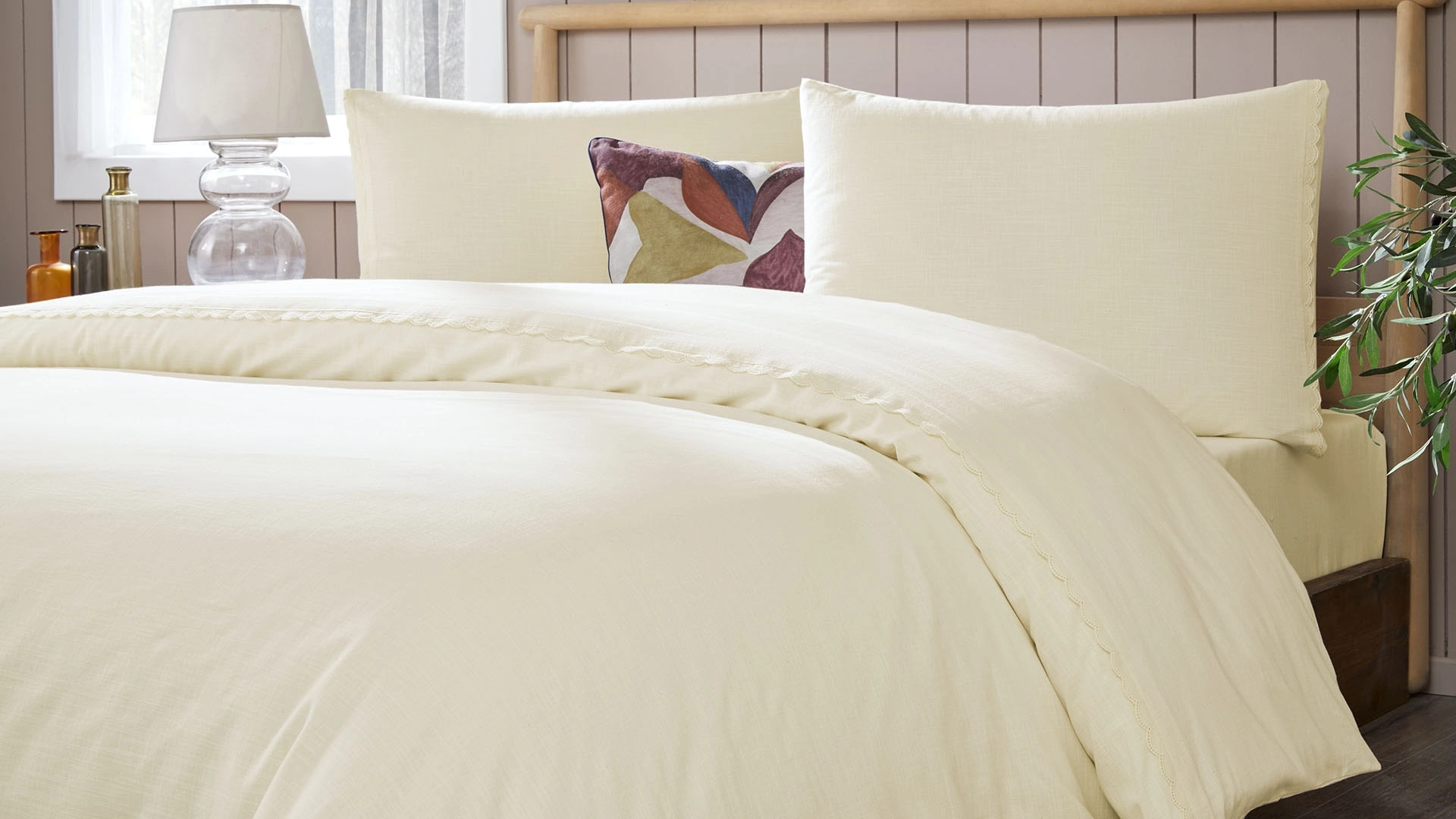 Bella nevresim takımı, pamuk kumaşıyla yumuşak ve konforlu bir uyku sağlarken, romantik dantel detaylarıyla odanıza zarif bir dokunuş katıyor.