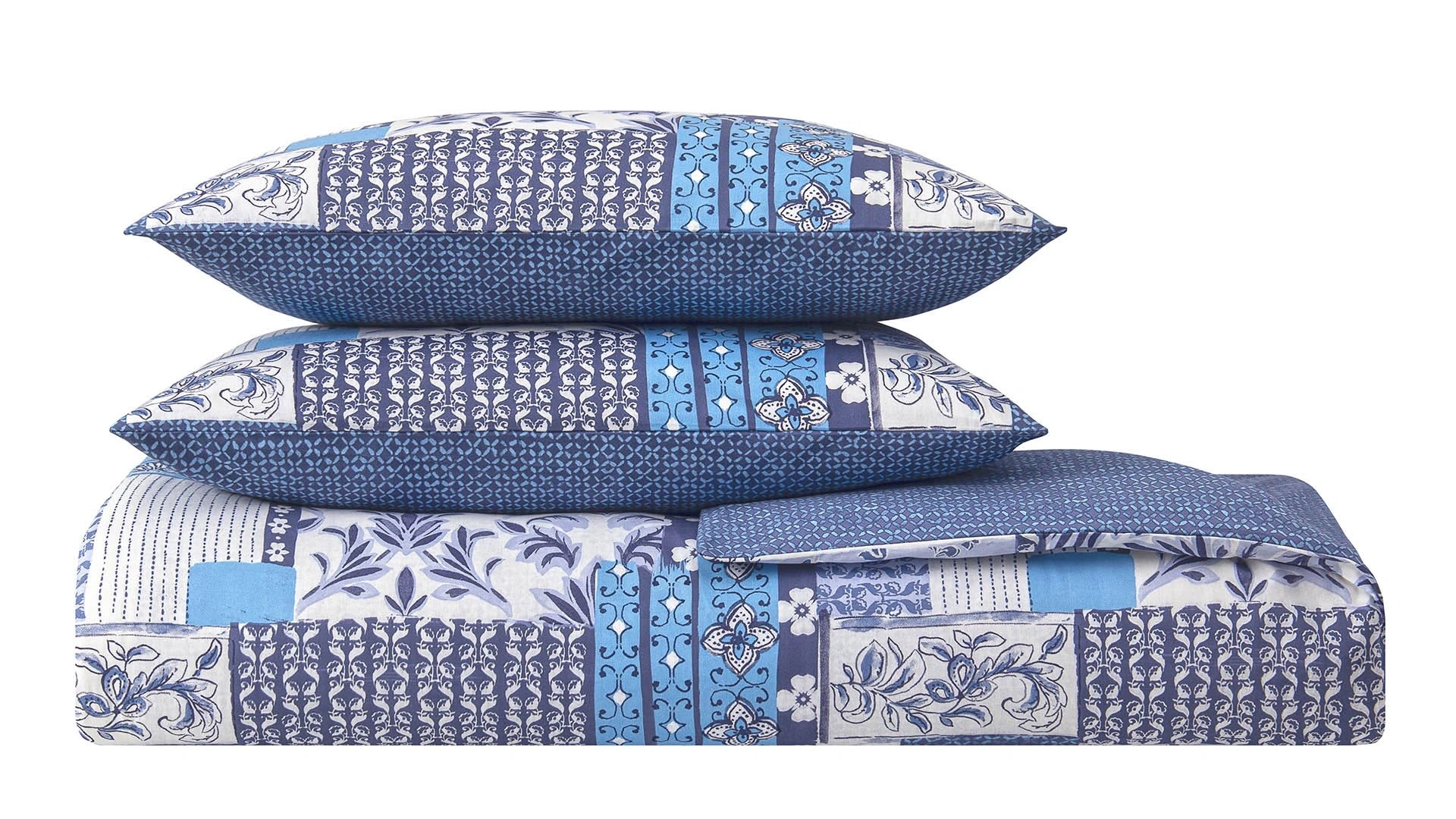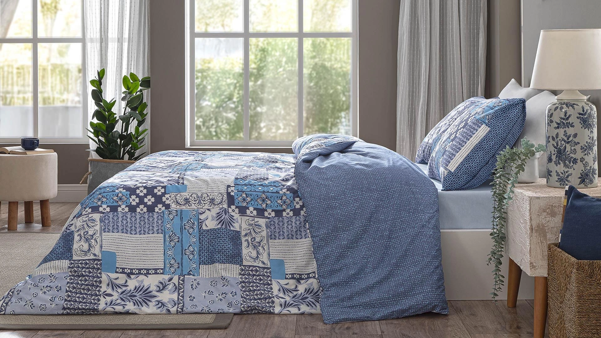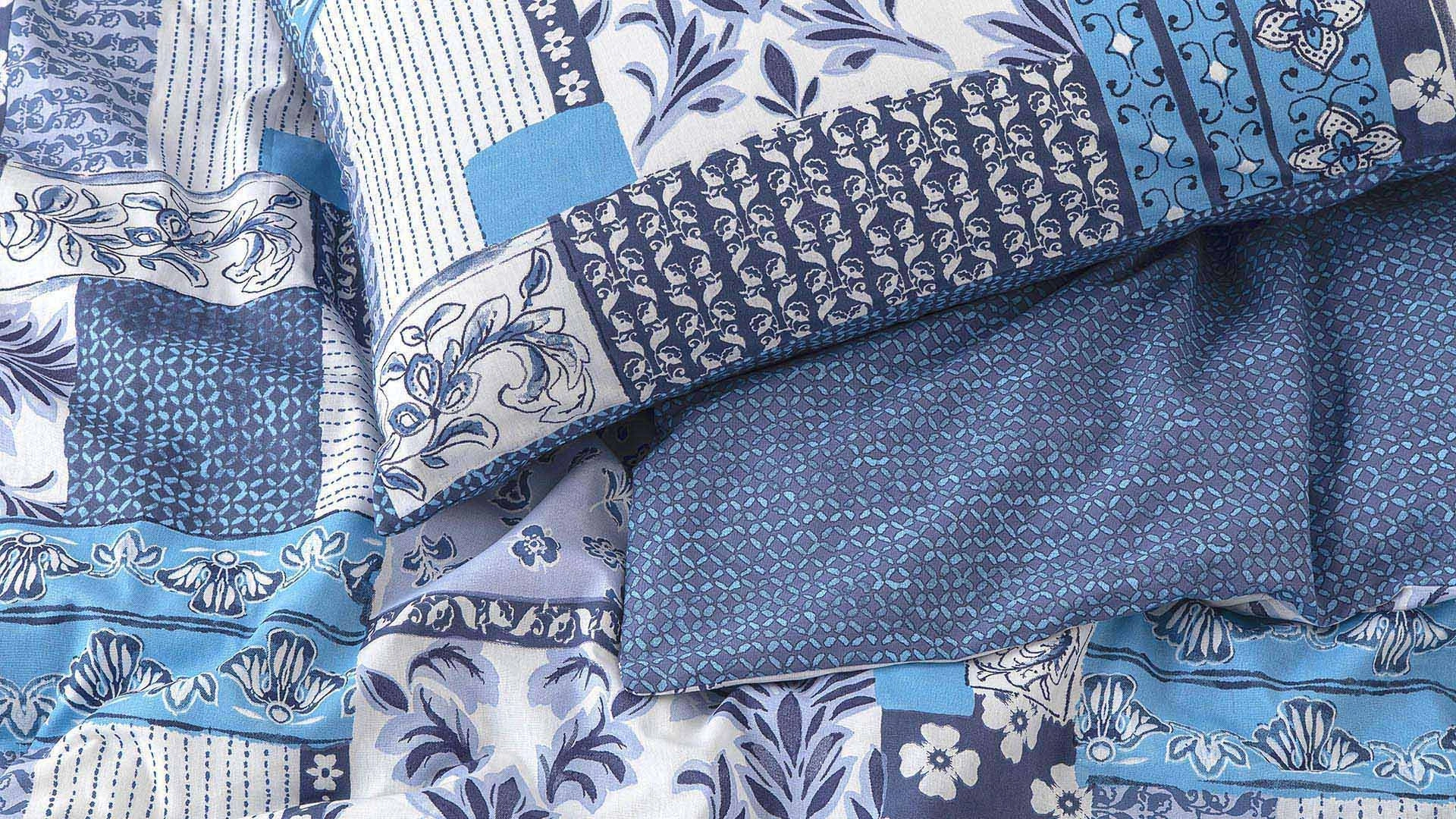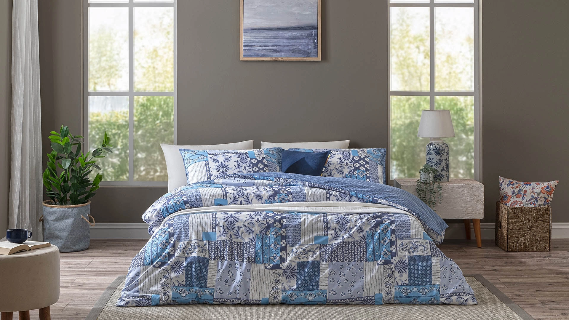 Modern ve nostaljik detayları bir arada sunan bu nevresim takımı, patchwork tarzındaki desenleriyle göz dolduruyor. Mavi tonlarının farklı dokularla bir araya getirildiği bu tasarım, özellikle sade dekorasyonları hareketlendirmek isteyenler için ideal. Geometrik yerleşim, takımın her parçasına canlılık katarken tek renk yastık ve üst parça sayesinde dengeli bir görünüm sunuluyor. Göz alıcı ama uyumlu bu takım, yatak odasına enerji katarken aynı zamanda sıcak ve davetkar bir his bırakıyor.