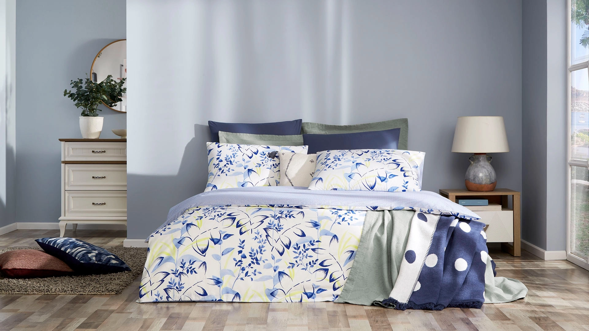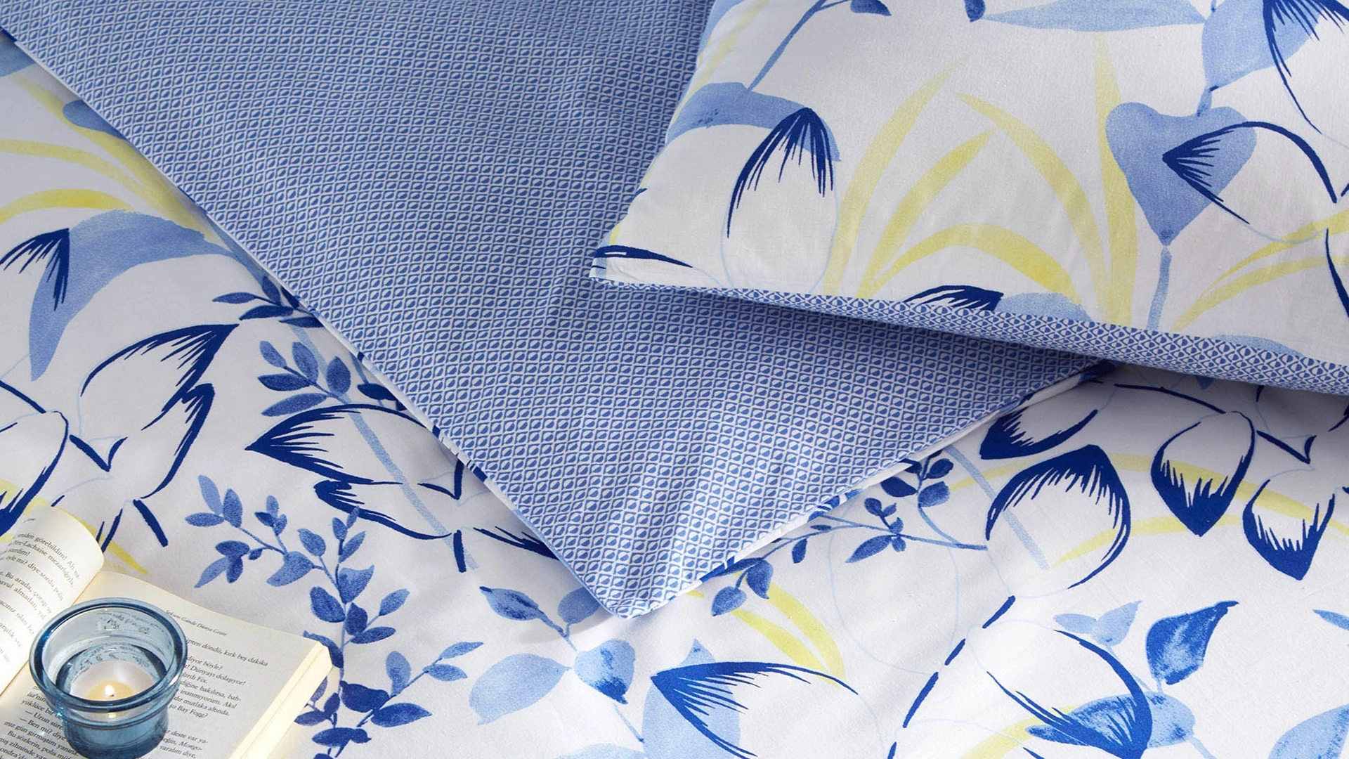 Bluish nevresim takımı, modern yaprak desenleriyle dikkat çekiyor. Yatak odasına taze ve huzur veren bir atmosfer katan bu takım, şıklığı ve rahatlığı bir araya getiriyor. Yüksek kaliteli kumaşıyla gece boyunca konforlu bir uyku deneyimi sunan bu nevresim takımı, modern tasarımıyla mekâna sofistike bir hava katıyor.