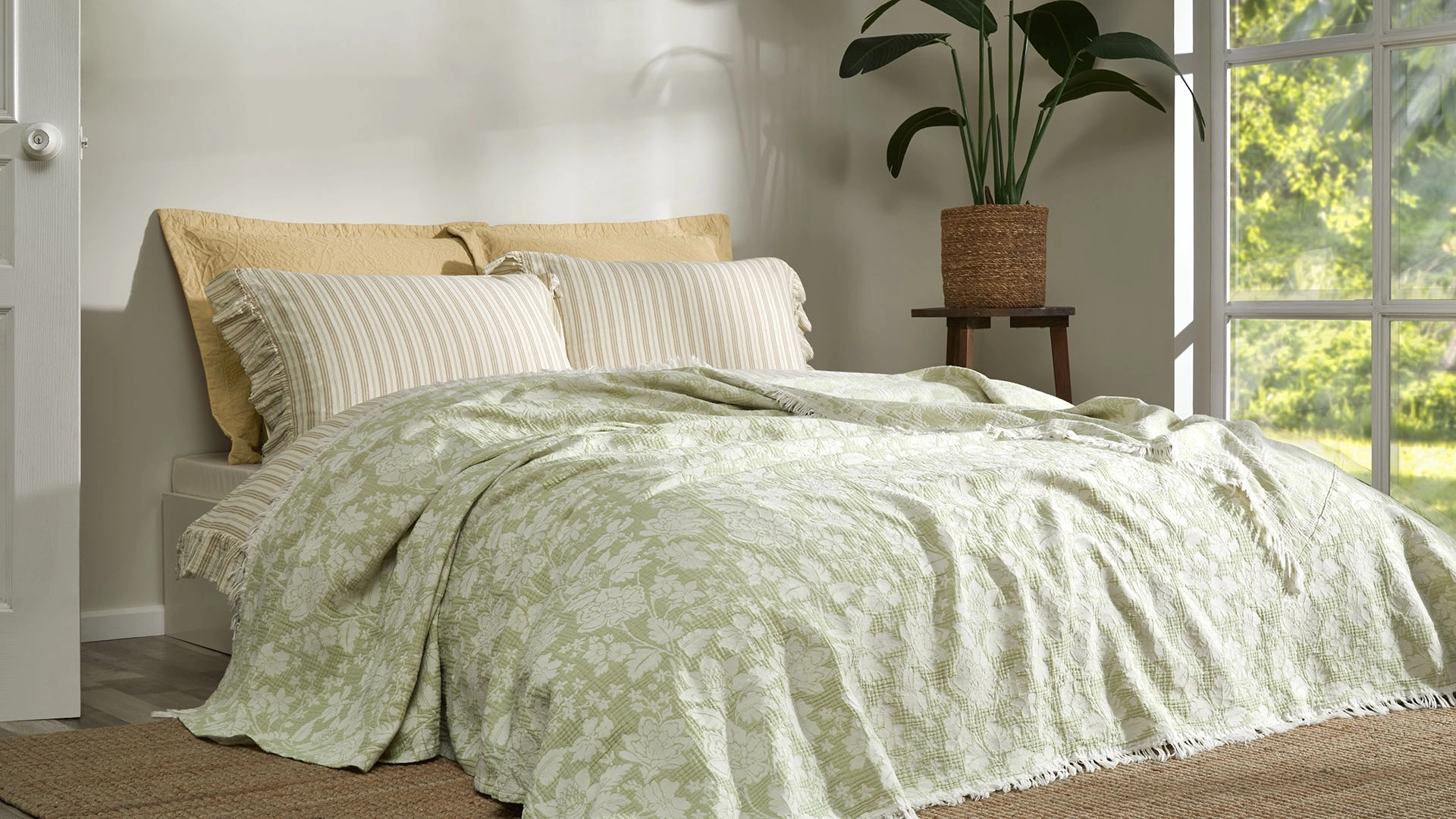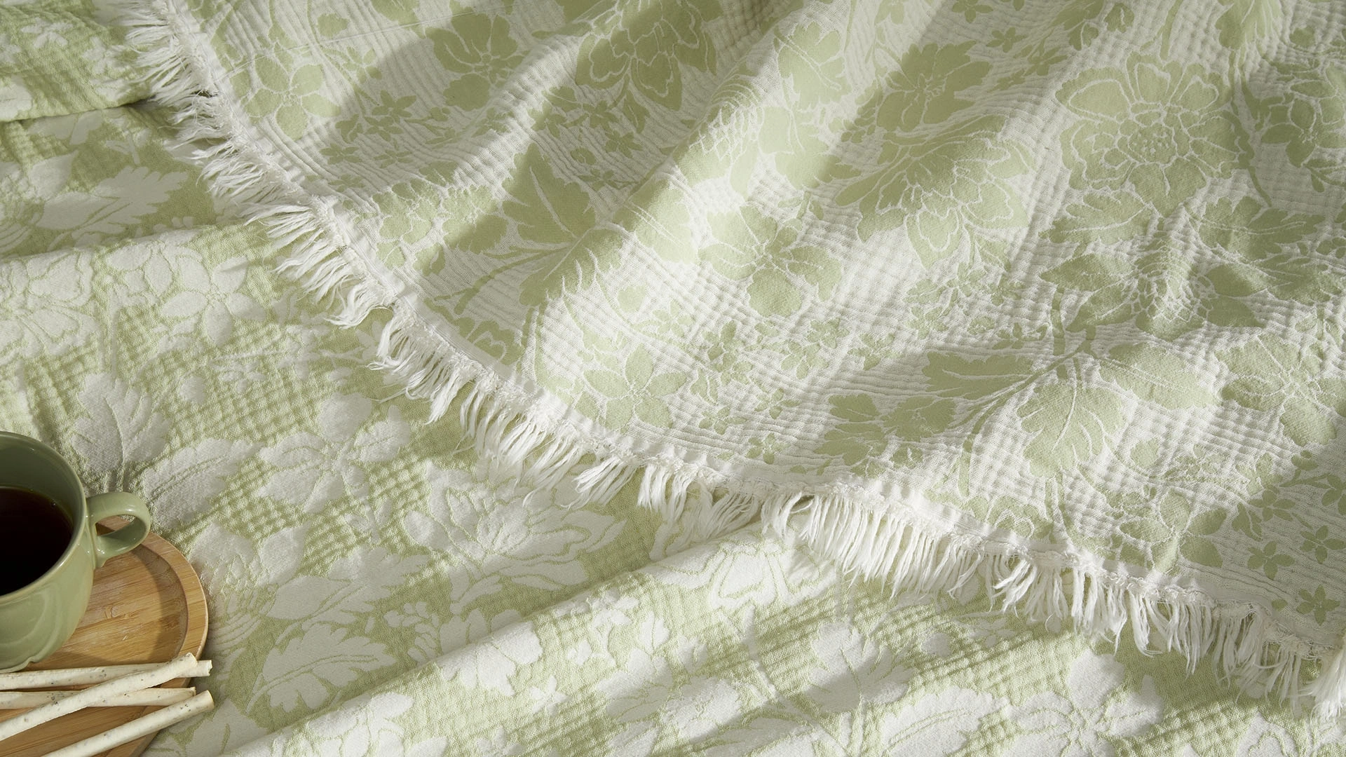 Calie yatak örtüsü, yumuşak kumaşıyla konforlu bir uyku deneyimi sunarken, kenarındaki püskül detayları ve romantik çiçek desenleriyle odanıza zarif bir dokunuş katıyor.