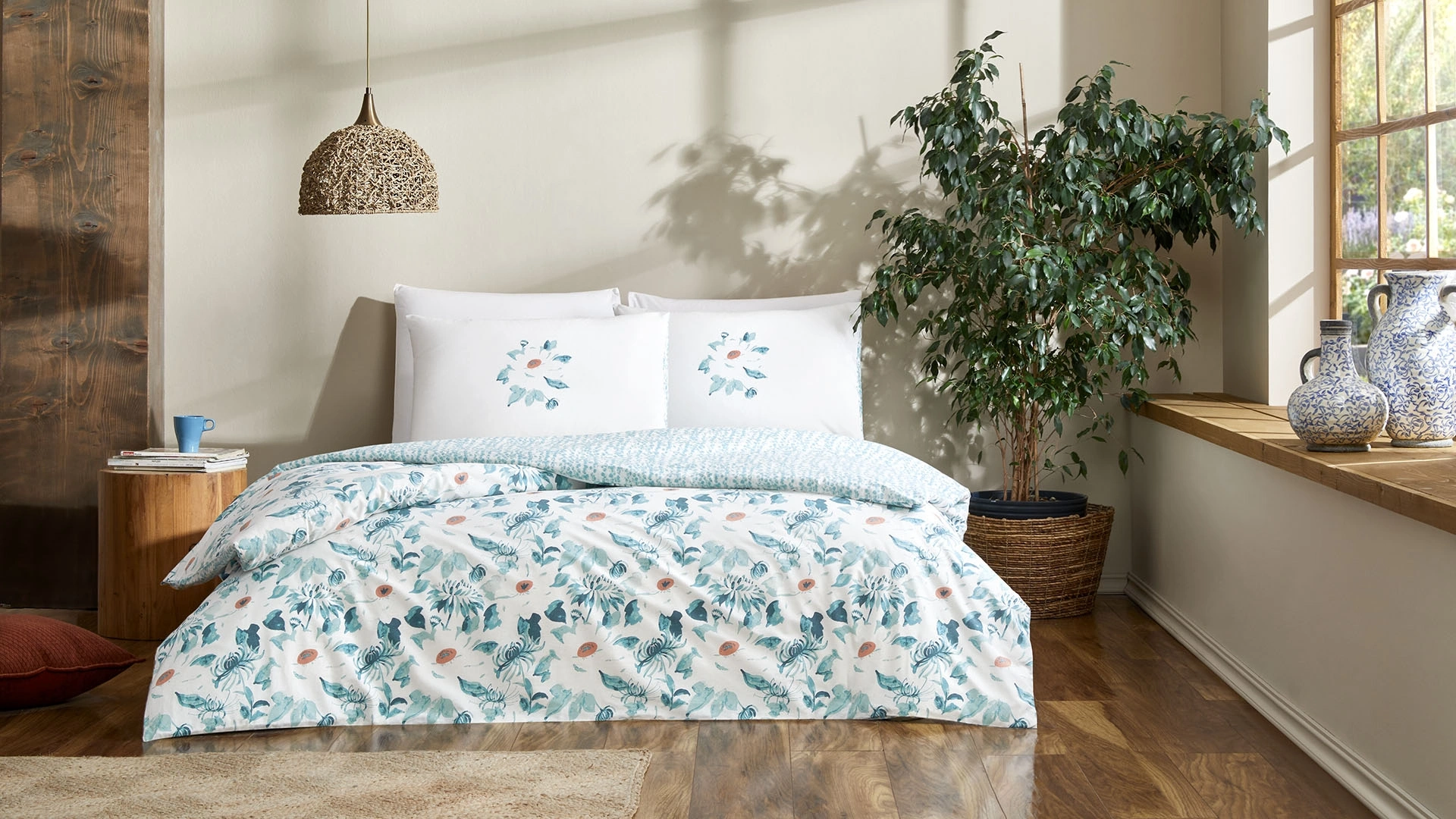 %100 pamuklu ve yumuşak dokulu Callista Nevresim Takımı, konforlu bir uyku deneyimi sunuyor. Zarif çiçek desenleri ve mavi tonları ile odanıza ferahlık ve şıklık katıyor. Çift taraflı kullanımıyla seçenek sunan Callista, estetik açıdan cazip bir atmosfer yaratarak yaz mevsiminin canlı renklerini yaşam alanınıza taşıyor.