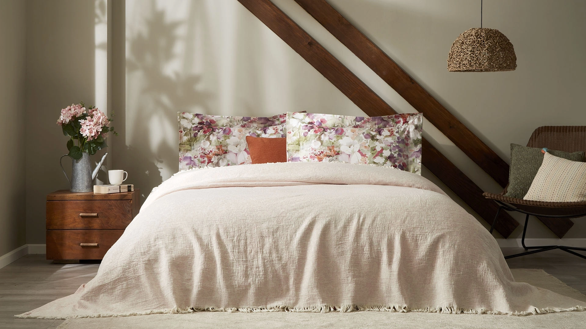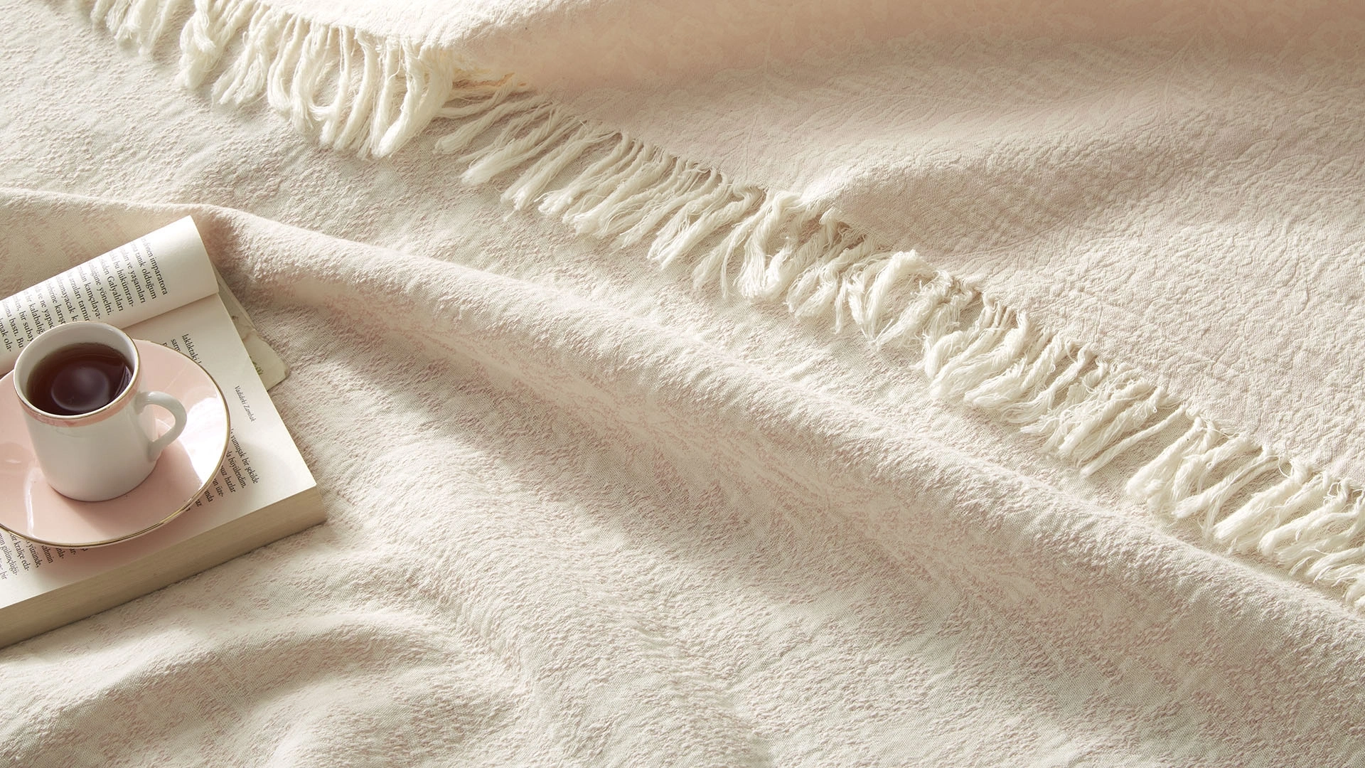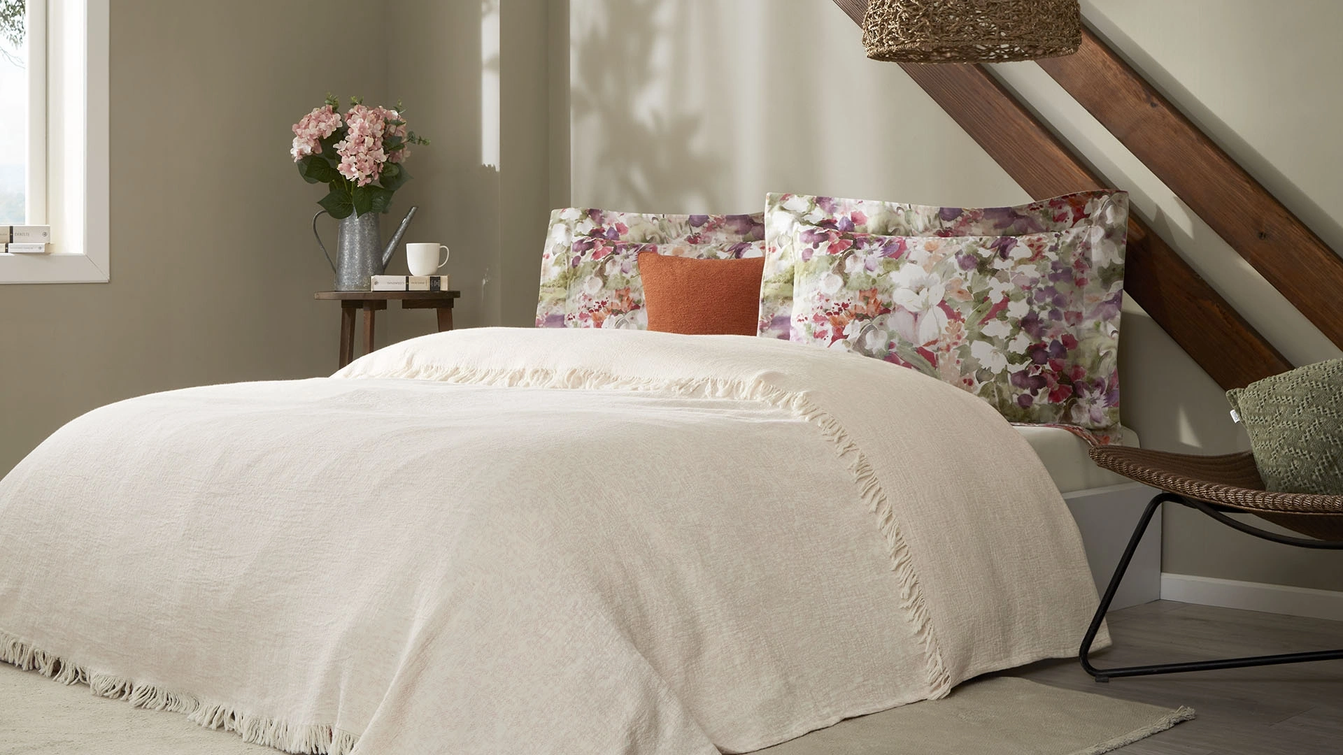Jane yatak örtüsü, yumuşak tuşe kumaşıyla lüks bir dokunuş sunarken, minimal çiçek ve yaprak deseniyle odanıza zarif bir görünüm katıyor. Kenarındaki püskül detayları ise şıklığı tamamlıyor.