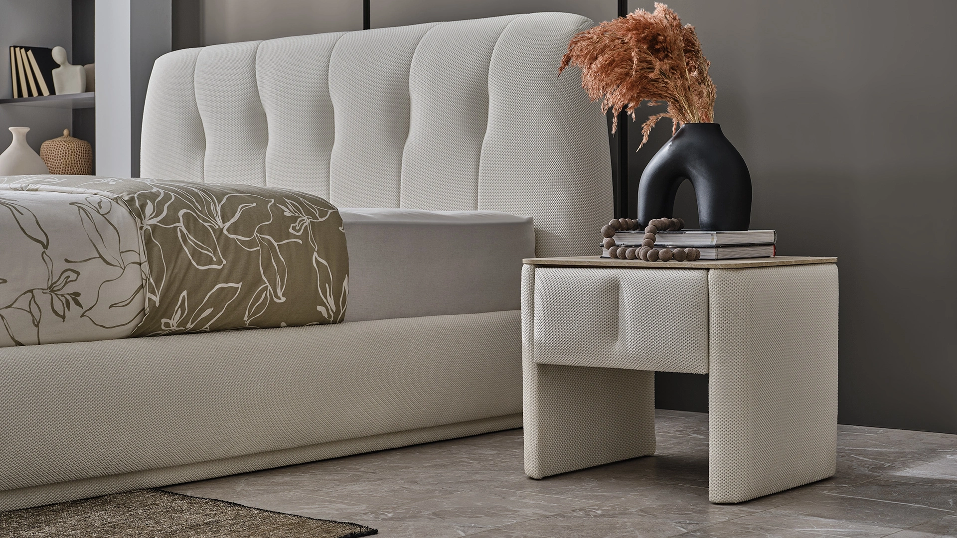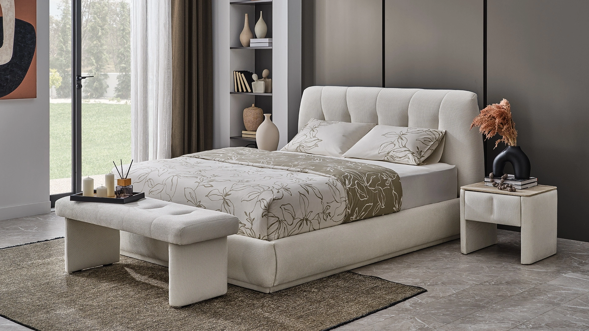 Modern çizgilerle yorumlanan bohem zarafeti, yatak odasında sofistike bir atmosferle buluşturur.Yumuşak formları ve kavisli yüksek başlığıyla güçlü ama sade bir duruş sunan bu set, estetik ve konforu doğal bir dengede bir araya getirir.