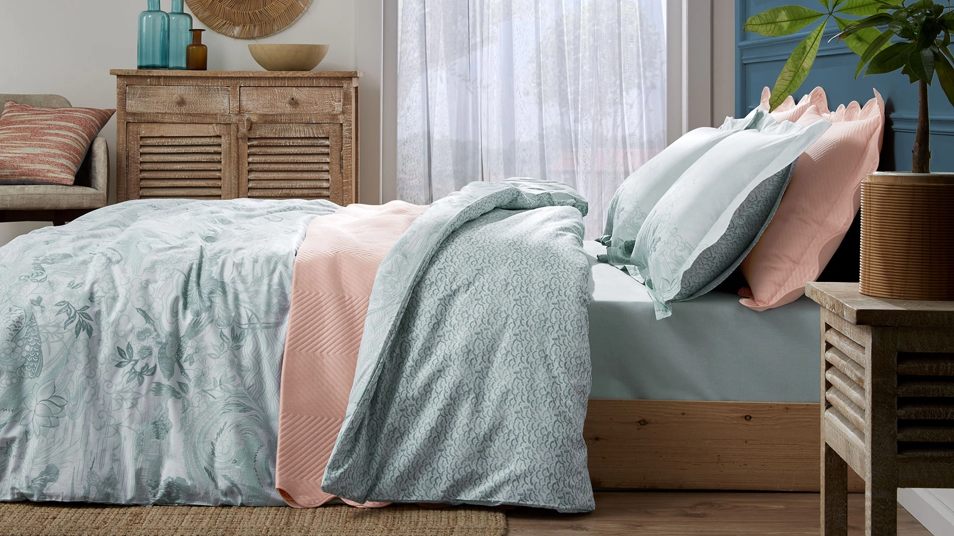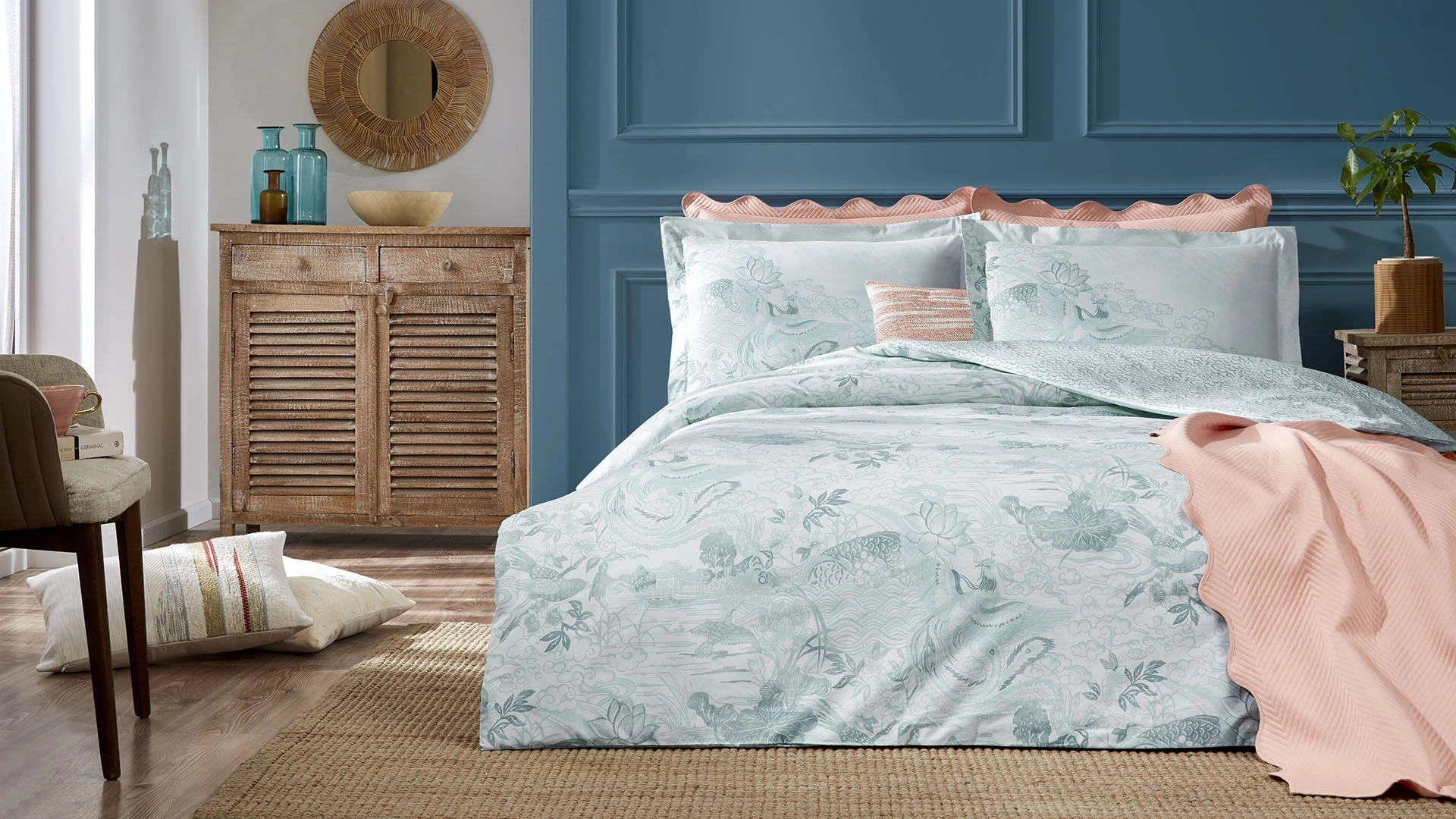 Mei Nevresim Takımı, yatak odanızda sade ve sofistike bir atmosfer yaratmak için ideal bir seçim. Pastel yeşil tonlarının huzur verici etkisi, uzak doğu esintisiyle buluşarak dingin bir uyku ortamı sunuyor. Estetik ve rahat bir deneyim sunan bu takım, minimalist tarzı sevenler için mükemmel bir tercih.