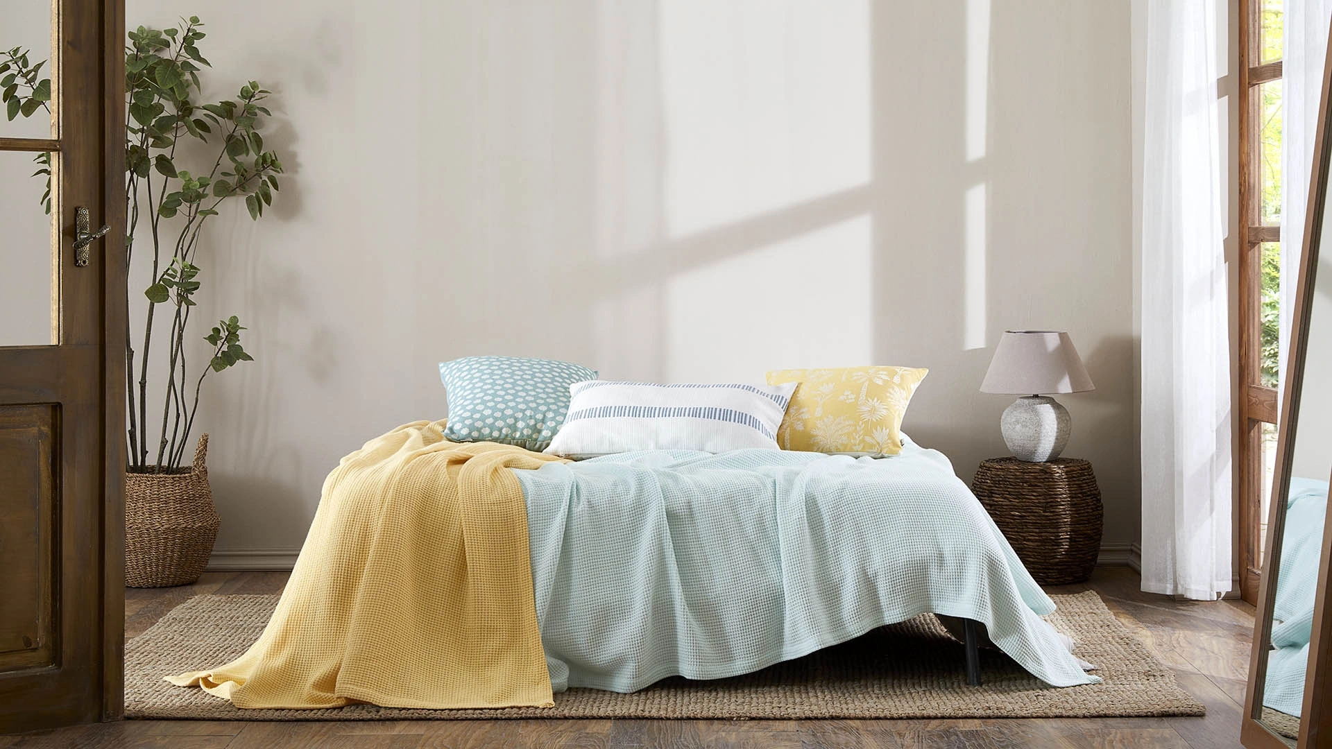 Yumuşak dokusuyla dikkat çeken Vaiden Pike, konforlu bir uyku deneyimi sunuyor. Mavi, beyaz, yavruağzı, sarı ve mint renk seçenekleri ile her zevke hitap eden Vaiden Pike, yatak odanıza renkli ve canlı bir hava katarken, şık tasarımı ile her mevsim ferah ve konforlu bir uyku ortamı sunuyor.