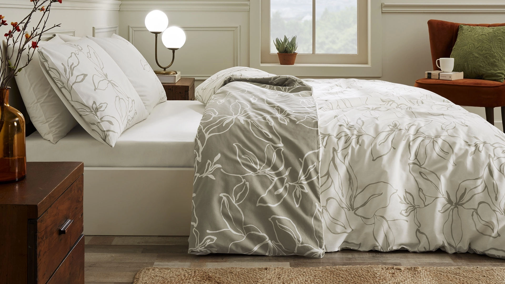 Ventra nevresim takımı, zarif yaprak desenleri ve sade tonların uyumuyla doğal bir şıklık sunar. Modern çizgilerle yorumlanan floral desenler, ortamda yumuşak ve dengeli bir atmosfer yaratır. Gri ve bej tonlarının uyumu ise dinginlik arayanlara hitap eder. Ventra nevresim takımının her iki yüzü de farklı renk zemine sahip aynı desenle tasarlanarak çift yönlü kullanım imkânı sağlar. Bu özellik sayesinde yatak odanızda ufak bir değişiklikle büyük bir etki yaratabilirsiniz.